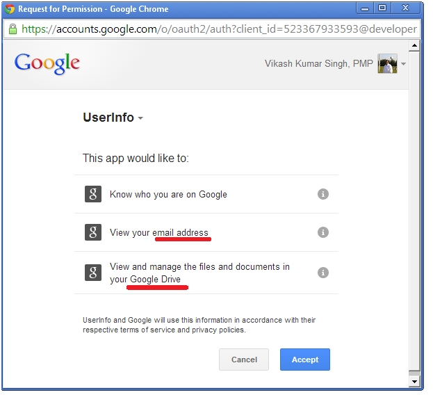 Google will show the Permission window and request for permission so that it can pull data from Google services such as Google Drive,and Google Account.